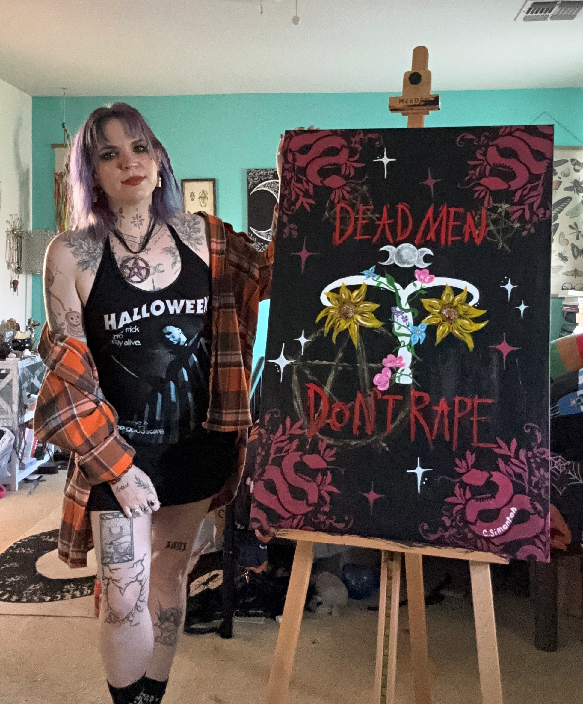 This is a witchy acrylic painting featuring a floral uterus and the words 'Dead Men Don't Rape'.