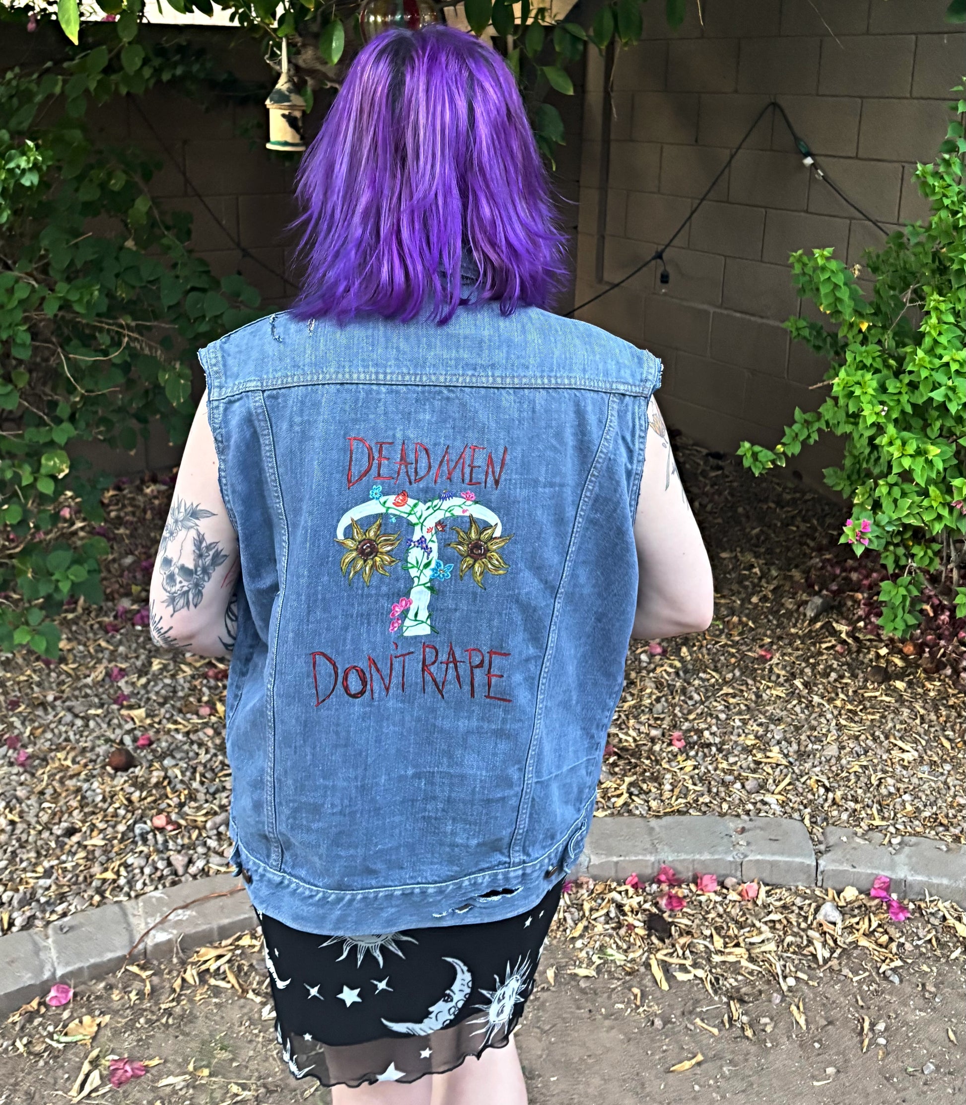 This is a repurposed jean jacket that has been grunged out (cut up and paperclips), and features my Dead Men Don't Rape artwork on the back.