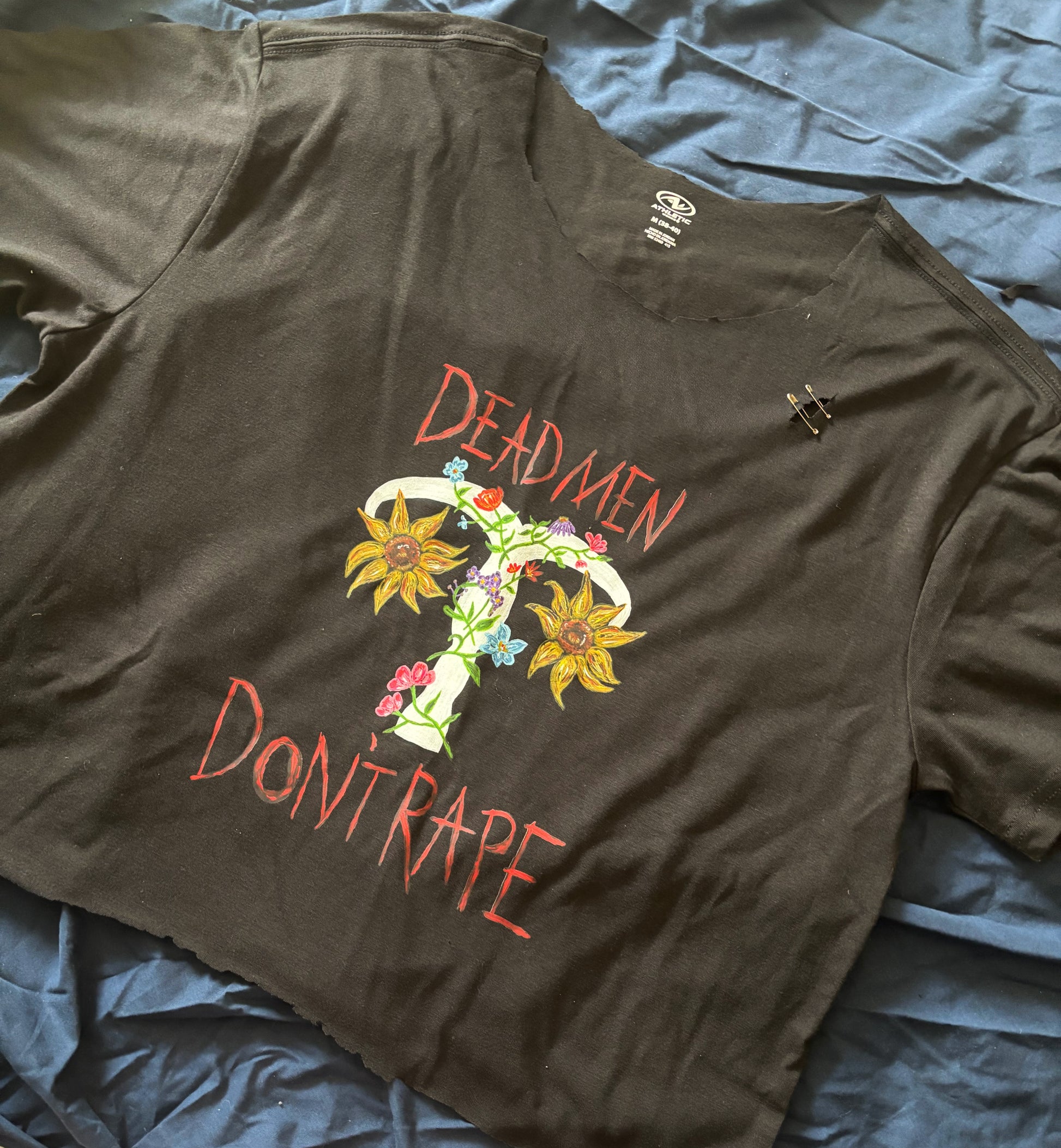 This is a shirt that features my uterus floral artwork and the words Dead Men Don't Rape.
