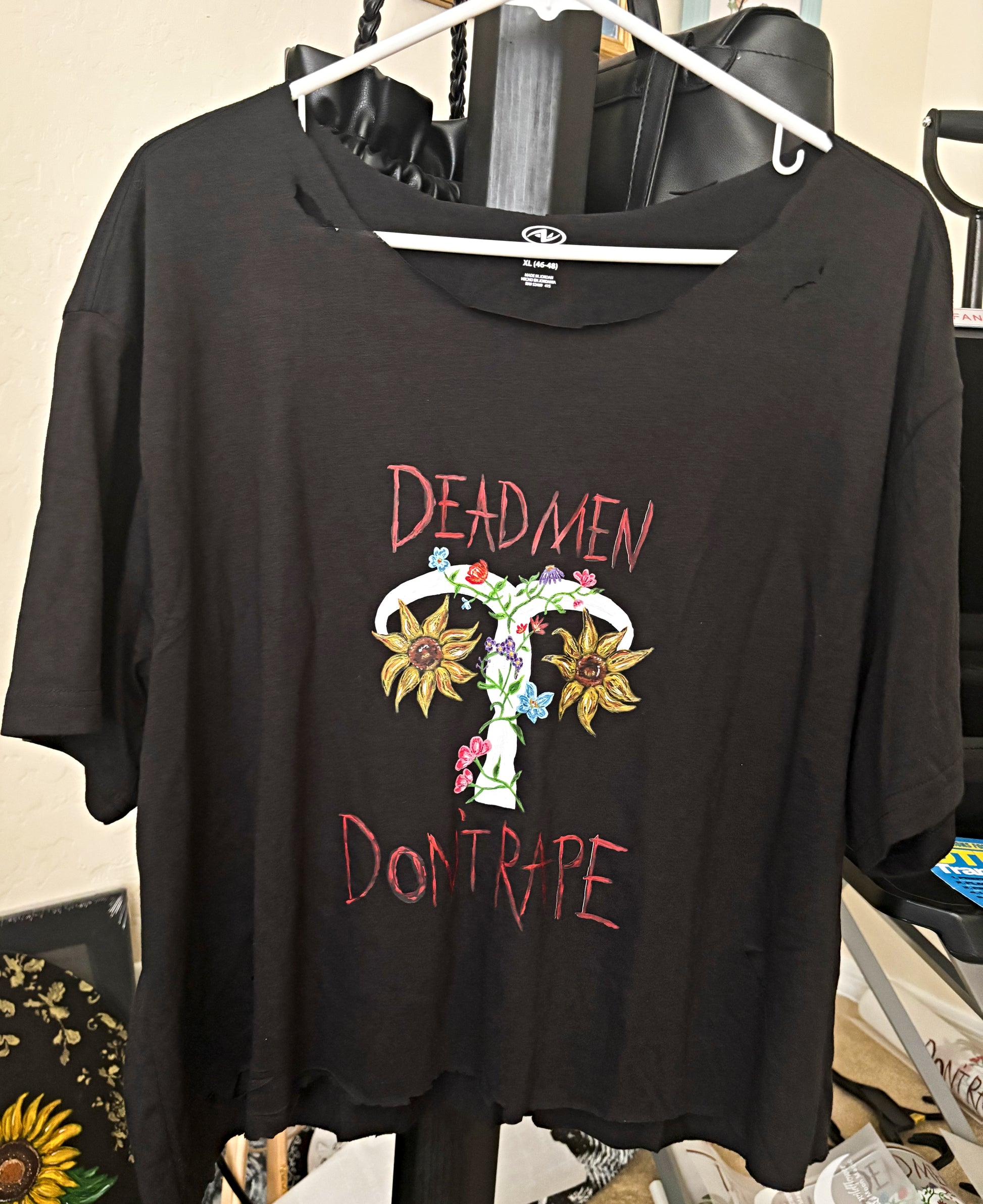 This is a shirt that features my uterus floral artwork and the words Dead Men Don't Rape.